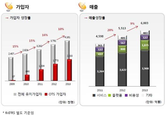 [KT스카이라이프]가 사상 최대 실적을 경신했다.28일 오전 KT스카이라이프는지난 4분기 매출이 전년 동기 대비 9% 증가한6,003 억원을 기록했다고 밝혔다.영업이익은 창사이래 최대규모인993억원으로 전년대비 47% 증가했으며당기순이익은 726억원으로동기대비 29% 올랐다.지난해 신규가입자는 87만명으로순증한 가입자는 39만명이다.작년 말을 기준으로KT스카이라이프를 유지한 가입자는전년 대비 10% 증가한 418명이며이중 OTS(올레tv스카이라이프) 가입자는 223만명으로전체 유지가입자 중 53%를 차지했다.총 비용은마케팅 비용 및 상각비가전년 대비 4% 늘어5,010억원을 기록했다.“OTS에 이어 SOD(실시간방송개별녹화서비스),DCS(접시 없는 위성방송) 등 디지털기술을 활용한혁신적인 융합서비스를 지속적으로 출시하고적극적인 서비스개선에 모든 역량을 집중할 것이다.”-KT 스카이라이프