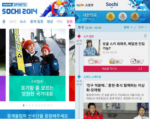 뿐만 아니라 포털 업계들도 많은 사람들이 모바일에서 소치동계올림픽을 즐길 수 있도록 PC뿐만 아니라 모바일 부문도 강화시켰다.'네이버'는 소치동계올림픽 특별 페이지를 신설하고 PC나 TV에 비해 상대적으로 모바일 화면이 작은 것을 고려해 모바일에 맞게 특화시켰다. 웹 페이지와 마찬가지로 대한민국 선수단 및 종목에 소개 등 각 섹션별로 필요한 정보를 한 눈에 확인할 수 있도록 디자인 했다.아울러 지상파 3사와의 계약을 통해 경기 생중계 및 하이라이트 영상을 감상할 수 있다. 또한 생중계를 놓친 이들을 위해 직접 경기 주요장면을 편집해 제공한다.‘다음’은 타임라인 형식으로 모바일 특집페이지를 신설해 시간대별로 나열된 주요 이슈를 클릭하면 기사 및 화보, 네티즌 참여공간 등으로 연결 되도록 했다.모바일 특집페이지는 소치 동계 올림픽의 실시간 주요 뉴스를 볼 수 있는 ‘뉴스’, ▲선수들의 땀방울까지 생생하게 느낄 수 있는 ‘포토’, ▲국가대표팀은 물론 모든 경기의 일정 및 경기결과 기록 등을 볼 수 있는 ‘일정·결과’, ▲대한민국 순위 및 대회 참여국 전체의 메달 현황을 볼 수 있는 ‘순위’, ▲많이 본 뉴스, 댓글 많은 뉴스, 공감 많은 뉴스, 인기 포토만 골라 볼 수 있는 ‘랭킹’, ▲이번 대회의 유망주와 화제의 선수를 볼 수 있는 ‘대표팀’ 등으로 구성됐다.
