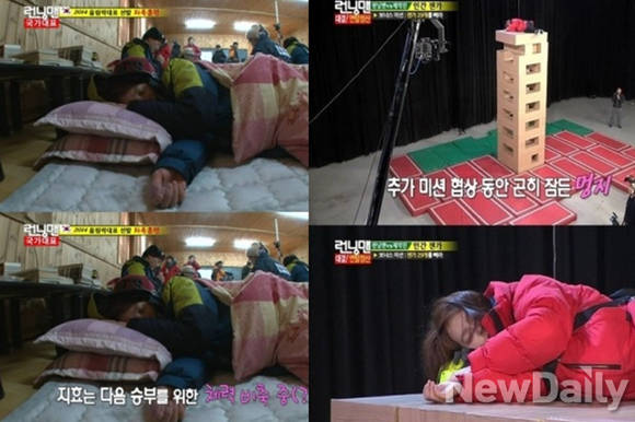 송지효가 낮잠 자는 모습은 이번이 처음이 아니다. 지난해 12월 29일 방송된 SBS <런닝맨>에서는 7m 높이의 젠가 블록 위에서 잠들어 놀라움을 자아낸 바 있다.