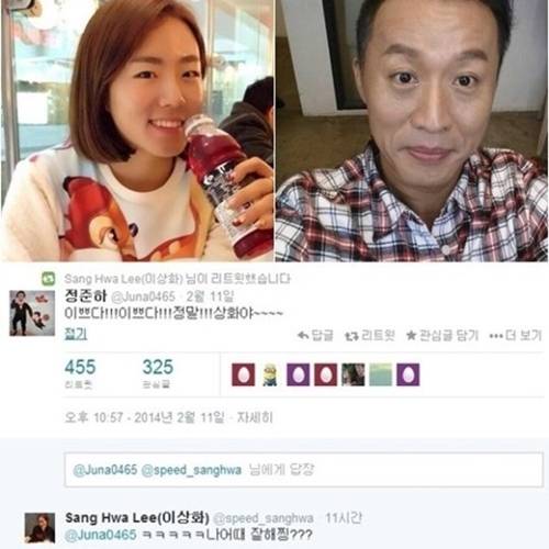 정준하와 스피드스케이팅 선수 이상화의 친분이 화제다.이상화는 지난 12일 오후 자신의 트위터를 통해 정준하에게 "나 어때 잘해찡?"이라는 글을 남겼다.이는 정준하가 이상화의 경기를 앞두고 앞서 11일 남긴 트윗글 "이쁘다! 이쁘다! 정말! 상화야"에 대한 화답이다. 이상화는 이 글을 리트윗하고 답글을 달았다.정준하는 지난 2010 밴쿠버 동계올림픽에서 금메달을 차지한 남자 스피드스케이팅 모태범 선수와 친분을 쌓았으며, 이후 모태범 선수의 소개로 이상화와도 친해진 것으로 알려졌다. 이상화는 2012년 5월 정준하의 결혼식에 참석하기도 했다.이상화는 지난 12일(한국시간) 러시아 소치 아들레르 아레나에서 열린 소치 동계 올림픽 스피드스케이팅 여자 500m에서 1, 2차 합계 1분14초70의 올림픽 신기록으로 금메달을 목에 걸었다.정준하 이상화 인연을 접한 네티즌들은 "정준하 이상화 친분 의외야", "정준하 역시 마당발 인맥이야", "정준하 이상화 인연 보기 좋네요", "정준하 이상화 친분 부럽다", "정준하 이상화 모태범 소개로 친해졌구나", "정준하가 달라 보여" 등의 다양한 반응을 보였다.[정준하 이상화, 사진=이상화 트위터]