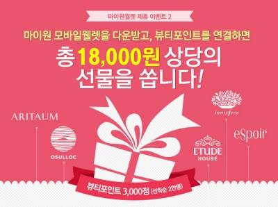 아모레퍼시픽은 ‘마이원 모바일 월렛’과 함께하는 뷰티포인트 제공 이벤트를 진행한다고 17일 밝혔다.마이원 모바일 월렛은 다음커뮤니케이션이 출시한 모바일 애플리케이션으로, 신용·체크카드에 다양한 멤버십을 연결해 카드 한 장으로 결제와 포인트 적립을 할 수 있는 서비스이다.아모레퍼시픽은 오는 28일까지 마이원 모바일 월렛에서 뷰티포인트를 신규로 연결한 고객 선착순 2만명에게 백화점, 아리따움, 오설록, 이니스프리 등 아모레퍼시픽 뷰티포인트 전 가맹점에서 사용할 수 있는 뷰티포인트 3000점을 제공한다.이와 함께 아리따움, 오설록, 이니스프리, 에뛰드, 에스쁘아 등 5개 브랜드에서 각각 3000원 할인쿠폰이 추가로 지급돼, 개인별로 최대 1만8000원 상당의 혜택을 제공받을 수 있다.쿠폰은 아리따움, 에뛰드, 이니스프리, 에스쁘아 매장과 오설록 홈페이지에서 사용 가능하다.또한 오설록 티하우스 등 각 오프라인 매장에서 마이원 모바일 월렛에 연결된 신용카드나 체크카드로 뷰티포인트를 적립하면, 기존 적립률의 2배인 6%를 적립해주는 더블 적립 이벤트가 올해 11월까지 진행된다.증정된 포인트는 적립일로부터 1년 간 유효하다.마이원 모바일 월렛은 안드로이드와 iOS에서 모두 다운로드 가능하다. 자세한 내용은 아모레퍼시픽 홈페이지에서 확인 가능하다.
