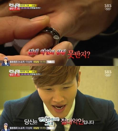 런닝맨 별그대 패러디‘런닝맨’ 김종국이 절대 악인 소시오패스 신성록으로 변신했다.지난 16일 방송된 SBS ‘일요일이 좋다-런닝맨’이 SBS 수목드라마 ‘별에서 온 그대’(이하 별그대)를 패러디했다.이번 런닝맨 별그대 패러디 ‘런닝 별에서 온 그대’ 편은 조선시대와 개화기, 현대를 넘나들며 절대 악인에 의해 위험에 빠진 천송이를 구하기 위한 숨막히는 대결을 펼쳤다.이날 미션에서 하하가 도민준을, 유재석이 천송이를, 김종국이 이재경으로 변신했으며 절대 악인 김종국은 멤버들의 이름이 적힌 못반지를 찾아 이름의 멤버를 한 명씩 아웃시키며 긴장감을 높였다.그러나 치열한 싸움 끝에 400년 후의 천송이로 환생한 유재석이 ‘절대 악인’ 김종국의 이름표를 뜯고 최종 우승을 차지했다.특히, 실제 드라마에서 등장하는 신성록의 소시오패스 반지가 절대 악인의 상징이자 승부를 가르는 중요한 매개체로 등장해 소름끼치는 반전 전개를 보여주는 데 큰 역할을 했다.이번 런닝맨 별그대 패러디에 등장한 신성록 반지는 실제 신성록이 드라마에서 착용한 반지와 동일한 제품이다. 국내 디자이너 브랜드 엠디엠지(mdmz)에서 런닝맨 멤버 한 명 한 명의 이름을 새겨 특별히 제작한 것으로 밝혀졌다.[런닝맨 별그대 패러디, 사진=SBS 런닝맨 방송 캡처]