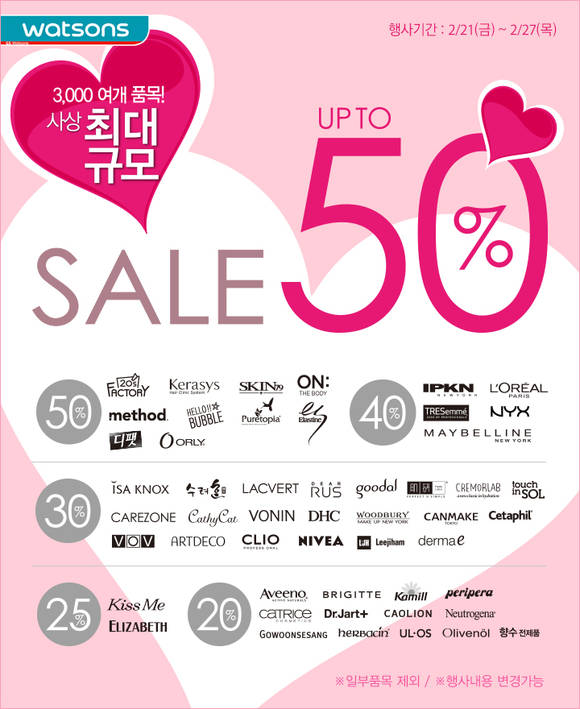 사상 최대 규모의 반값 할인 이벤트가 진행된다.헬스&뷰티 스토어 GS왓슨스는 21일부터 27일까지 일주일간 사상 최대 규모의 반값 할인 이벤트를 진행한다.GS왓슨스는 키스미, 로레알, 메이블린, 캐트리스, 오를리, 클리오, 아르데코 등의 전문 색조 브랜드를 비롯하여 시즌에 관계 없이 스테디셀러 자리를 지키며 고객들의 지속적인 사랑을 받고 있는 니베아, 아비노, 세타필, 허바신 등의 바디 케어 브랜드를 최대 50% 할인된 가격으로 판매한다.또 겨울 동안 예민해진 피부를 위한 고운세상, 닥터자르트, 케어존 등의 더마 코스메틱뿐 아니라 이자녹스, 라끄베르, 수려한의 LG생활건강 등 수많은 브랜드가 참여하는 할인 행사를 진행함으로써 다가오는 봄을 맞아 화장품을 준비하려는 고객들의 관심을 사로 잡을 계획이다.아모레 퍼시픽의 아이오페와 라네즈, 마몽드 제품들은 21일부터 23일까지 3일간만 할인 행사를 실시한다.GS왓슨스가 이같이 최대 50% 할인 행사를 진행하는 것은 다가오는 봄맞이 쇼핑시즌에 맞춰 할인 행사를 진행함으로써 고객들이 그동안 필요했던 화장품을 알뜰하게 구매할 수 있도록 하기 위함이다.알뜰한 화장품 구매를 통한 만족감이 GS왓슨스에 대한 만족감으로 이어질 수 있도록 할 계획인 것.정진선 GS왓슨스 마케팅 팀장은 "GS왓슨스의 up to 50% 할인 행사는 매번 고객들의 폭발적인 호응을 얻은 이벤트"라며 "그동안 필요했던 상품들을 고객들이 알뜰하게 구매할 수 있어 만족감이 매우 큰 행사가 될 것이다"라고 말했다.