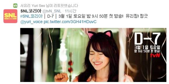 성우 겸 방송인 서유리가 깜찍한 고양이로 변신했다.케이블 채널 tvN 예능프로그램 'SNL코리아' 제작진은 22일 공식 트위터를 통해 "3월 1일 토요일밤 9시 50분 첫방송"이라는 글과 함께 함께 한 장의 사진을 올렸다.공개된 사진 속 서유리는 "유리찡! 찡긋"이라는 멘트와 함께 고양이 귀 모양 머리띠를 한 채 눈웃음을 짓고 있다.오는 3월 1일 첫 방송을 앞둔 tvN 'SNL코리아'는 벌써 다섯 번째 시즌을 맞았다. 이번 시즌 5에는 브아걸 멤 버 나르샤, 비투비 서은광, 개그맨 김두영, 뮤지컬 배우 정상훈 등이 고정크루로 합류했다.'SNL코리아' 시즌5는 내달달 1일 오후 9시 50분 첫 방송된다.[서유리, 사진=SNL코리아 공식 트위터]