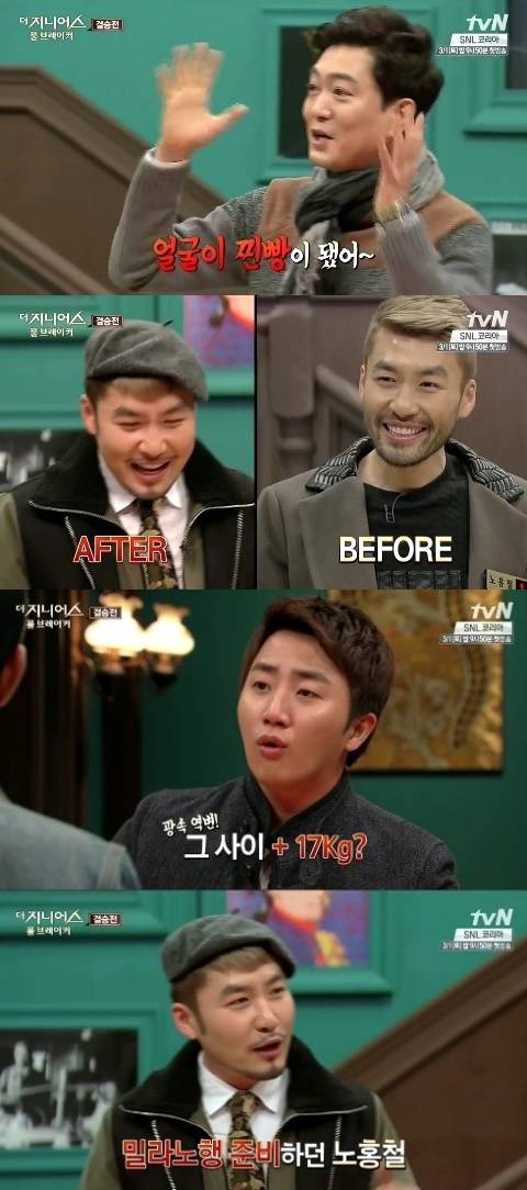 노홍철이 몰라보게 살찐 모습으로 '더 지니어스2'에 등장해 모두의 놀라움을 자아냈다.노홍철은 지난 22일 방송된 tvN '더 지니어스:룰 브레이커'(이하 더 지니어스2) 12회에 탈락자들과 함께 게스트로 특별 출연했다.이날 게스트들은 눈에 띄게 살 찐 노홍철을 보고 깜짝 놀랐다. 이에 홍진호는 "17kg이나 쪘다더라"고 폭로했으며, 유정현은 "얼굴이 찐빵이 됐다"고 놀렸다.노홍철은 "내가 좀 달라졌다. MBC '무한도전' 밀라노행이 다 엎어졌다. 살이 많이 붙었다"고 민망한 웃음을 지었다.노홍철 17kg 증가 소식을 접한 네티즌들은 "노홍철 17kg나 찐거야?", "다이어트 요요 왔구나", "노홍철 17kg나 찌다니 놀라워", "정준하는 하루 6끼 먹고 노홍철은 대체 몇 끼를 먹는 거야", "노홍철 17kg 다시 빼면 안되나" 등의 반응을 보였다.[노홍철 17kg 증가, 사진=tvN '더 지니어스2' 방송 캡처]