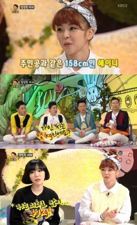 브라운아이드걸스 가인이 몸무게 망언을 했다.지난 24일 방송된 KBS 2TV '대국민 토크쇼 안녕하세요'(이하 안녕하세요)에는 배우 홍경인과 김인권, 가수 가인과 혜이니가 출연해 솔직한 입담을 뽐냈다.이날 방송에는 키 158cm에 몸무게 33kg으로 너무 말라 취직이 안되는 26세 여성의 사연이 소개됐다. 이에 혜이니는 "나도 키가 158cm고 몸무게가 37kg"이라고 고백해 모두의 놀라움을 자아냈다.이어 MC들이 가인에게 몸무게를 묻자 "의외로 많이 나간다"고 말끝을 흐리더니 이내 "47gk다"고 밝혀 망언 스타로 등극했다.가인의 망언에 이영자는 "야 그거 갖고 그래"라며 발끈했고, 신동엽은 "두 사람 몸무게를 합쳐도 이영자 몸무게를 못 이긴다"고 너스테를 떨어 웃음을 자아냈다.특히, 이영자의 몸무게도 함께 공개돼 눈길을 끌었다. 이영자는 사연의 주인공을 안고 체중계에 오르니 115kg이었다. 결국 이영자의 몸무게는 82kg인 것으로 드러났다.[혜이니 가인 몸무게 공개, 사진=KBS2 '안녕하세요' 방송 캡처]