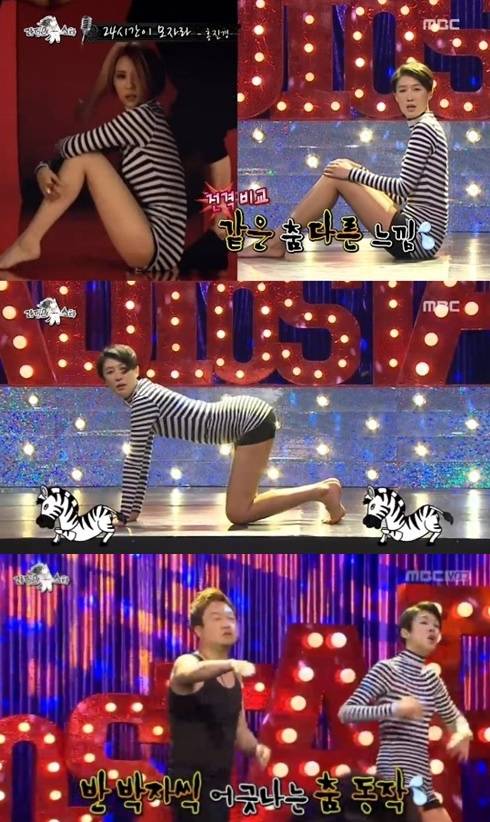 홍진경 24시간이 모자라홍진경이 선미로 깜짝 변신했다.지난 26일 방송된 MBC '황금어장-라디오스타'에는 '단추 구멍' 특집으로 홍진경, 개그맨 윤형빈, 박휘순, 가수 이민우, 가인이 출연해 솔직한 입담을 선보였다.이날 홍진경은 선미에게 직접 공수해 온 줄무늬 무대의상을 입고 '24시간이 모자라' 무대를 재현했다.홍진경은 긴 팔과 다리를 이용해 맨발 댄스를 췄지만 다소 어설픈 모습으로 웃음을 자아냈다. 특히, 박휘순과 함께 끈적끈쩍한 커플댄스를 춘 홍진경은 필 충만한 표정을 지어 MC들을 초토화시켰다.홍진경의 '24시간이 모자라' 무대가 끝난 후 MC 윤종신은 "팔이 왜 이렇게 기냐"며 놀렸고, 김국진은 "얼룩말인 줄 알았다"고 말했다.[홍진경 24시간이 모자라, 사진=MBC '라디오스타' 방송 캡처]