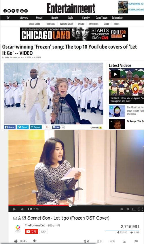 앞서 지난 3일 미국의 유명 연예 매체인 엔터테인먼트 위클리(Entertainment Weekly)는 디즈니사 애니메이션 '겨울왕국' 수록곡이자 제 86회 아카데미 시상식 주제가상을 수상한 '렛잇고(Let it go)' 커버 영상 중 가장 높은 조회수를 기록한 단 10개 영상을 선정해 발표했다.