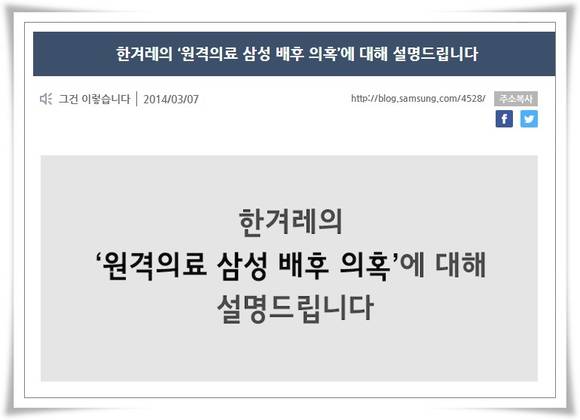 삼성그룹이 정부 추진의 ‘원격의료 사업’과 관련 삼성이 배후라고 지목한 한 칼럼에 대해 '사실무근'이라며 강력 반발하고 나섰다.7일 한겨레신문 김의겸 논설의원은 ‘박근혜와 이건희 누가 더 쎌까’라는 제목의 칼럼을 통해 원격의료 정책을 삼성이 기획하고 배후 조종했다는 의혹을 제기했다.이와 관련 삼성 측은 공식 삼성블로그 ‘그건 이렇습니다’ 코너를 통해 “원격의료 정책을 마치 삼성이 기획하고 배후 조정한 것처럼 주장했다”며, “한겨레가 제기한 의혹은 전혀 사실이 아니며 논리 전개상 오류도 많다”고 조목조목 반박했다.우선 정부가 2009년 발표한 ‘신성장동력 종합추진계획’ 중 U헬스 부분이 정부가 아닌 삼성경제연구소의 발원지가 됐다는 주장과 관련 삼성은 “삼성경제연구소의 경우 1년에 수백 건씩 다양한 산업 동향 보고서를 내고 있으며, U헬스 보고서 역시 일상적 보고서 중 하나에 불과하다”고 설명했다.이어 “당시 삼성경제연구소의 보고서에 앞서 다른국내 연구소들도 U헬스 산업 관련 책과 보고서를 발표한 바 있으며 특히 해외에서는 2000년대 초반부터 관련 보고서가 쏟아지고 있었다”며, “당시 보고서를 쓴 삼성경제연구소 연구원도 앞서 발표된 다른 기관 보고서들을 참고해서 작성했다고 해당 보고서에 밝힌 바 있다”고 강조했다.예컨데 2005년 고려대 U헬스사업단 출범, 2006년 아주대의료원 U헬스정보연구소 출범 등 국내 대학들도 삼성의 보고서보다 빨리 움직이고 있었고, U헬스 관련 언론보도도 일일이 열거하기 어려울 정도로 많았다는 것.삼성은 “이런 상황이다 보니 당시 보고서를 쓴 삼성경제연구소 연구원도 앞서 발표된 다른 기관 보고서들을 참고해서 작성했다고 해당 보고서에서도 밝힌 바 있다”고 전했다.정부가 아이디어를 받아주자 삼성이 2010년 의료기기 등 신수종 사업을 발표했다는 의혹에 대해서도 삼성 측은 “이미 1980년대 미국 GE의 의료기기 국내 판매를 대행하다가 1984년 이병철 선대회장의 지시로 GE와 합작으로 ‘삼성의료기기’를 설립했고 이후 양사 간 협의를 거쳐 순차적으로 사업을 정리했다”고 설명했다.이어 “삼성과 GE는 1990년대 지분 재조정을 하면서 삼성이 향후 일정 기간 관련 사업에 진출하지 않는다는 계약을 맺었는데, 201년 경 이 계약이 풀리면서 자연스럽게 의료기기 사업에 다시 진출한 것”이라고 말했다.즉 선대회장 시절부터 수십 년의 역사를 가진 삼성의 의료기기 사업을 단순히 정부 특혜를 받고 시작했다고 주장하는 것은 사실을 왜곡하는 것이라고 삼성 측은 꼬집었다.그런가 하면 최근 삼성이 선보인 ‘기어피트’는 심장박동을 재는 기능이 있어 원격의료를 염두해 만든 작품이라는 주장에 대해서도 “IT기기가 건강 관리 기능을 내장하는 것은 전 세계적인 트렌드로, 삼성전자의 ‘기어피트’ 이전부터 나이키, 조본 등이 ‘피트’형 제품을 경쟁적으로 출시했다”고 반박했다.실제 애플과 구글도 운동과 건강관리 기능을 강화한 웨어러블 기기 출시를 앞두고 있는 게 현실인데, 전세계 IT업체들이 집중하는 웨어러블 기기를 지적해 ‘원격진료 음모론’을 제기하는 건 억측이라는 게 삼성 측 주장이다.이번 한겨레신문의 칼럼과 관련 삼성 측은 “한겨레식 주장대로라면 삼성경제연구소가 낸 모든 보고서에는 거대한 음모가 숨어 있고, 정부의 정책은 삼성의 보고서 하나에 좌지우지되며, 삼성전자가 내놓는 신제품도 다 그런 전략의 일환이 되고 만다”며 유감의 뜻을 표했다.이어 “삼성에 대한 건전한 비판과 감시를 넘어 정상적인 경영활동까지 ‘이건희 회장의 생각이 박근혜 대통령의 입을 빌려 현실화되고 있는 셈’, ‘공무원들이 월급은 나라에서 받으면서 충성은 삼성에 바치는 게 아닌가’라며 음모론적 시각으로 매도하는 비상식적인 일은 더 이상 없길 바란다”고 당부했다.한편 최근 정부 추진의 원격의료와 관련 서울의대 교수들이 잇따라 '찬성' 의견을 밝혀 귀추가 주목되고 있다.분당서울대병원 성형외과 허찬영 교수는 ‘국내 유헬스 원격의료, 2015년 즈음하여’라는 의견서를 통해 만성창상 환자의 원격의료 도입을 주장한 바 있다.의견서는 병원 성형외과가 개발한 스마트폰과 태플릿 PC를 이용한 원격 만성창상 관리 프로그램을 3년간 60명의 피시험자를 대상으로 진행한 결과 높은 권고 일치율과 사용자 만족도 등으로 유용성이 증명됐다는 내용을 담고 있다.이 같은 주장에 이어 서울대병원 흉부외과 이정렬 교수도 ‘안방에서 의사를 만난다면...’이라는 제목의 기고문을 한 일간지에 게재하면서 ‘원격의료 도입 찬성’을 피력했다.그는 “우리나라 정보통신기술 발전 및 의료산업 융합과 경쟁력 측면에서 더 이상 늦출 수 없는 국가적 과제이기 때문”이라고 주장한 바 있다.의료계의 한 관계자는 “이제 원격진료는 의료 전산화라는 거대한 흐름 중의 하나라고 보면 된다”며, “의료분야에서 정보통신 혁명은 이미 선진국을 중심으로 한 세계적 흐름으로 의무기록 전산화를 비롯해 유전자 정보, 의료용 로봇, 사이버 병원 등 무수히 많은 분야가 완성됐거나 개발을 기다리고 