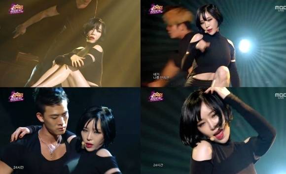 가수 가인이 '24시간이 모자라' 무대로 남심을 사로잡았다.8일 방송된 MBC '쇼! 음악중심' 400회 특집에서 가인과 선미는 서로의 노래를 바꿔 부르는 스페셜 무대를 선보였다.이날 가인은 몸에 밀착되는 절개된 섹시 의상을 입고 맨발로 등장했다. 그녀는 선미의 '24시간이 모자라' 안무를 완벽 소화하며 뇌쇄적인 눈빛과 도발적인 포즈로 섹시미를 한껏 뽐냈다.특히, 가인은 남성댄서와 환상적인 호흡을 자랑하며 선미의 몽환적인 섹시미와는 또 다른 섹시미로 시선을 사로잡았다.가인 '24시간이 모자라' 무대를 접한 네티즌들은 "가인 24시간이 모자라 눈을 뗄 수가 없었다", "음악중심 400회 볼거리 정말 풍성하더라", "가인 24시간이 모자라 무대 황홀해", "선미랑 또 다른 느낌.. 농익은 섹시미 대박!", "가인 24시간이 모자라 남심 제대로 홀렸다" 등의 반응을 보였다.[가인 24시간이 모자라, 사진=MBC '음악중심' 400회 특집 방송 캡처]