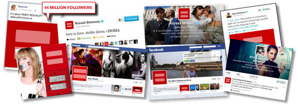 비욘세가 “It's about TIME!!! #EQUALITY #MarryWhoYouLove,”라고 SNS에 올리자 44백만명이 넘게 리트윗을 했다. 디카프리오, 알리시아 키스, 제이슨 므라즈, 알리사 밀라노, 마사 스튜어트 등 연예인들이 잇달아 페이스북의 얼굴을 빨간 로고로 바꾸고 트윗에 참여하기 시작하면서 동성애자 결혼은 삽시간에 세계적인 핫이슈로 떠올랐다.