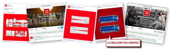 몇 주 전 미국 대법원에 어느 동성애자 커플이 동성애 결혼 위법 여부를 묻자 HRC가 캠페인에 나섰다. 자신들의 캠페인 로고(파란 바탕에 노란색 두 줄)를 빨간색 바탕에 핑크색 두줄을 그린 로고로 바꿔 SNS 등에 올리는 구전 마케팅을 펼쳤다. 72시간도 안돼 상원의원 5명이 지지의사를 천명했고 공화당 의원들과 오바바 대통령까지 지지에 나섰다.
