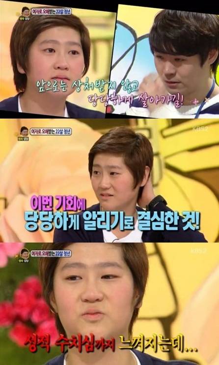 안녕하세요 여자같은 남자'안녕하세요'에 여자같은 남자가 등장했다.지난 17일 방송된 KBS 2TV '안녕하세요'에서는 여자로 오해받는 22살 청년 이태관씨의 사연이 공개됐다.이날 고민남은 "남성 호르몬 수치가 낮아서 2차 성징이 안 왔다. 호르몬 주사를 맞아도 몸은 변화가 없고, 경제적 부담에 치료마저 중단한 상태"라고 밝혔다.'안녕하세요' 여자같은 남자는 수염이 하나도 없고, 목소리조차 여성스러우면서 목울대까지 없어 놀라움을 자아냈다.또한, 그는 "목욕탕에 가면 무조건 여자 표를 준다. 신분증을 꺼내서 확인을 시켜줘도 위조인 줄 알고 긁어본다"며 "여자 친구와 점을 보러 갔는데 점쟁이가 '요즘 너희 같은 애들 많아'라고 하더라"고 고충을 토로했다.이태관씨는 "호프집에서 손님들이 말을 건다. 나를 두고 돈 내기도 하고, 확인을 위해 가슴을 만지려고 한다. 그럴 땐 성적 수치심이 느껴진다"고 말하며 눈물을 흘렸다.이어 "난 남자니까 더 이상 묻지 말았으면 좋겠다"라며 "또 말이 먼저 나와야 좋지, 손이 먼저 나오지 않았으면 좋겠다"고 호소해 모두를 안타깝게 만들었다.[안녕하세요 여자같은 남자, 사진=KBS2 '안녕하세요' 방송 캡처]