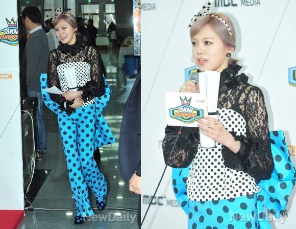 이날 리지는 도트무늬의 파란색 바지와 블랙 시스루로 장식된 화려한 상의를 입고 등장했다. 특히, 허리에 바지와 같은 색상, 무늬의 대형 리본을 달아 눈길을 끌었다.