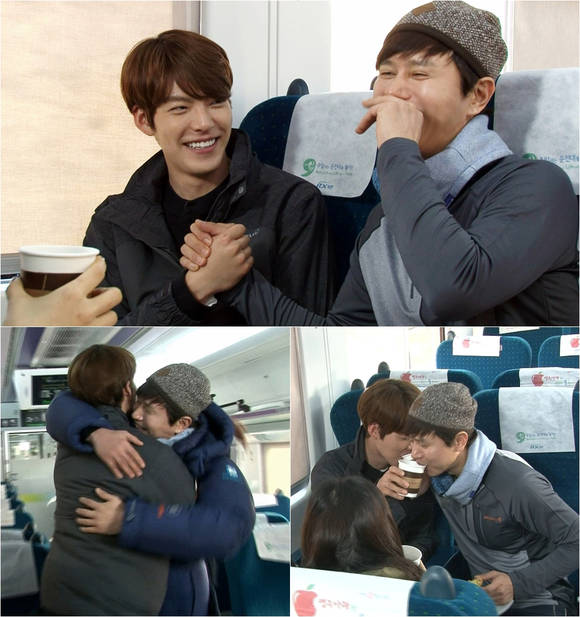 춘천으로 향하는 기차에 탑승한 김우빈은 김민종이 기차에 오르자 격한 포옹으로 상남자 매력을 물씬 풍겨냈다. 드라마 '신사의 품격'에 같이 출연했던 두 사람은 방송에서 2년 여 만에 재회하게 됐고, 김우빈은 김민종을 보자 와락 그를 끌어안은 뒤 자연스럽게 손을 잡는 등 시종일관 애정행각(?)을 벌였다.