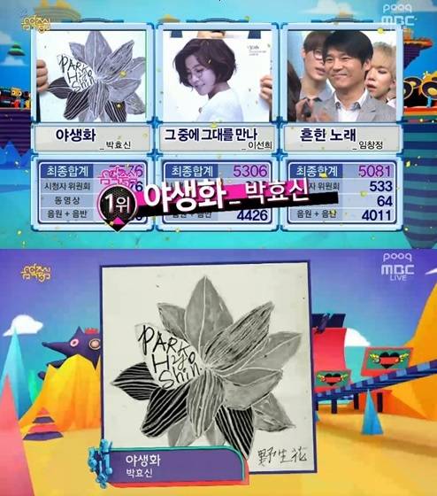 박효신은 5일 방송된 MBC '쇼! 음악중심'에서 '야생화'로 이선희 '그 중에 그대를 만나', 임창정 '흔한 노래'를 제치고 1위 트로피를 거머쥐었다.