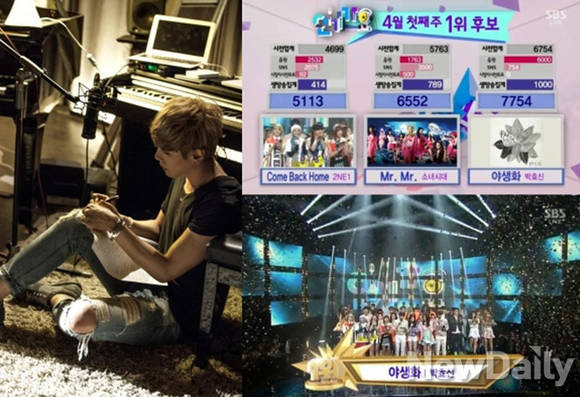 가수 박효신이 '음악중심'에 이어 '인기가요' 정상에 등극했다.박효신은 6일 방송된 SBS '인기가요'에서 '야생화'로 2NE1 '컴백홈(Come Back Home)'과 소녀시대 '미스터 미스터(Mr. Mr.)'를 제치고 1위 트로피를 거머쥐었다.이는 전날 MBC '쇼 음악중심'에서 방송 활동 없이 1위를 차지한 데 이어 또 한 번 1위에 올라 남다른 저력을 과시했다.박효신의 '야생화'는 추운 겨울 들판에 피어난 야생화처럼 시련과 어려움을 이겨내고 음악을 통해 다시 비상하겠다는 박효신의 의지가 담긴 곡이다.'인기가요' 박효신 1위 소식을 접한 네티즌들은 "인기가요 박효신 1위 축하해요!", "직접 '야생화' 무대 보고 싶어요", "인기가요 박효신 1위 별다른 활동없이 대단하다", "걸그룹 누르고 1위라니 정말 놀라워", "인기가요 박효신 1위 역시 발라드 황제" 등의 반응을 보였다.[인기가요 박효신 1위, 사진=SBS '인기가요' 방송 캡처/젤리피쉬]