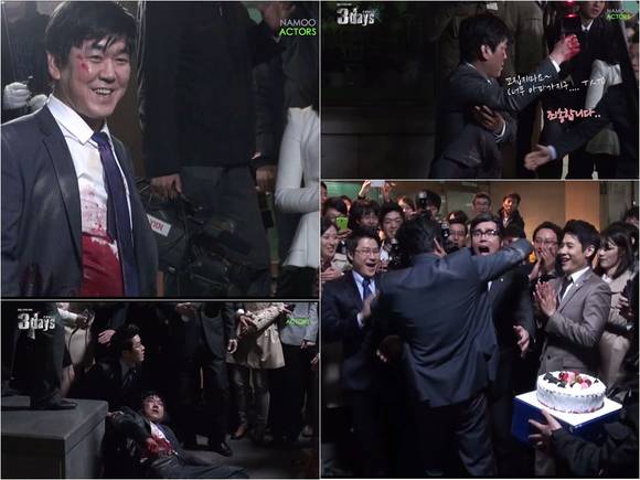 '쓰리데이즈' 윤제문이 하차 소감을 밝혔다.배우 윤제문은 SBS 수목드라마 '쓰리데이즈'에서 청와대 비서실장 신규진 역을 맡아 열연을 펼치다 지난 11회 방송분에서 죽음을 맞으며 하차했다.이에 윤제문의 소속사 나무엑터스는 공식 유투브 채널을 통해 마지막 촬영 비하인드 영상을 공개했다. 영상 속 배우 윤제문은 죽음을 맞이 하는 장면에서 피칠갑 분장을 하는 모습, 열정적인 리허설, 화기애애한 촬영 현장 분위기까지 엿볼 수 있다.특히, 마지막 신이 끝나자마자 모든 배우 및 스태프들과 "수고했다"는 인사를 나누며 준비한 케이크에 방긋 웃는 윤제문의 귀여운 매력이 눈길을 끈다.윤제문은 소속사를 통해 "드라마 '쓰리데이즈'를 하면서 좋은 선후배들과 함께할 수 있어서 기뻤다. 연기하면서도 겉으로는 엘리트지만 속에는 열등감을 갖고 사는 신규진이라는 인물이 안쓰럽고 측은했다. 신규진이라는 캐릭터를 사랑해주시고 지켜봐 주셔서 감사하다. 남은 이야기도 재밌게 봐달라"고 전했다한편, 지난 9일 방송된 SBS 수목드라마 '쓰리데이즈'는 윤제문이 죽음을 맞이하며 기밀문서 98의 존재를 세상에 알리며 새로운 국면을 맞이했다. '쓰리데이즈' 12회는 10일 밤 10시 방송된다.['쓰리데이즈' 윤제문, 사진=나무엑터스는 공식 유투브]