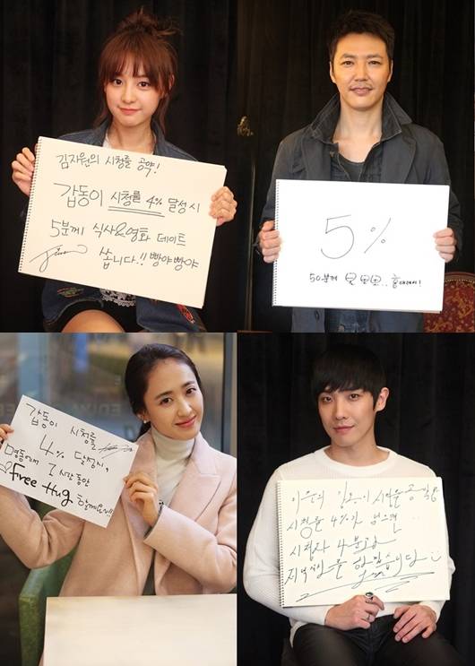 공개된 사진에서 윤상현은 "시청률 5% 돌파 시 50분께 볼뽀뽀…홍대에서!"라는 훈훈한 공약을, 김민정은 애교 넘치는 표정으로 "갑동이 시청률 4% 달성 시 명동에서 1시간 동안 프리허그할게요"라는 공약을 내세웠다.