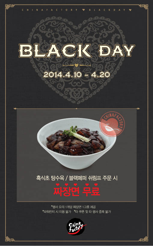 4월 14일 외로운 솔로들이 '짜장면'을 먹는다는 '블랙데이'다. 이에 식품업계가 솔로들에게 심심한 위로를 전하고자 '블랙데이' 이벤트를 진행하고 있다.11일 CJ푸드빌 차이나팩토리에 따르면 2011년부터 지난해까지 블랙데이 당일은 일 평균 짜장면 판매량 대비 평균 140%가 증가한 것으로 나타났다. 블랙데이가 솔로들을 위한 날이 아닌 '블랙푸드'를 즐기는 날로 인식되고 있다는 분석이다.이에 차이나팩토리는 20일까지 대표 블랙메뉴인 '흑식초 탕수육'과 '블랙페퍼 쉬림프'를 주문하면 짜장면을 무료로 제공한다. 또한 차이나팩토리를 더욱 가볍고 편안하게 즐길 수 있는 '차이나팩토리 딜라이트'에서는 '흑식초 탕수육' 주문시 짜장면을 414원에 즐길 수도 있다.팔도는 '일품짜장면'(4입 번들) 2개가 들어 있는 철가방 세트를 경기지역 중대형매장 중심으로 4월 한 달 동안 판매한다. 중국집에서 배달할 때 사용하는 은색 철가방을 종이박스 모형으로 제작한 것으로 간편하게 '진짜 짜장면'을 만들어 먹을 수 있다.또한 팔도블로그 '온종일 맛있는 생각뿐'에서는 '나만의 일품짜장 레시피 귀뜸 이벤트'를 14일까지 진행한다. 팔도 블로그에 '일품짜장면'을 활용한 다양한 요리법을 블로그에 공유하면 되며, 추첨을 통해 5명에게는 솔로탈출을 위한 응원선물을, 15명에게는 솔로들을 위한 힐링선물을 제공할 계획이다.세븐일레븐은 이달 말까지 행사 상품 구매고객 중 추첨을 통해 1004명을 선정하여 유럽 여행상품권, 모바일상품권 등을 증정하는 '혼자 떠나는 꽃보다 여행' 이벤트를 진행한다. 유럽 여행은 스페인, 이탈리아, 터키, 크로아티아 4개국으로 국가별 1명씩 선정하고, 3천원 상당의 세븐일레븐 모바일 상품권은 총 1천명에게 증정한다. 참여는 전국 세븐일레븐 점포에서 짜파게티, 초콜릿, 오레오초코 등 블랙데이 행사 상품 30여 종을 구매 후 영수증 하단 행운번호를 홈페이에 응모하면 된다.황진복 세븐일레븐 마케팅팀장은 "발렌타인데이, 화이트데이 등 연이은 커플 기념일로 인해 지친 솔로들을 위해 준비한 블랙데이 행사"라며 "최근 케이블방송 인기 프로그램에서 소개된 유럽 여행지들을 중심으로 경품을 준비했다"고 말했다.GS25도 블랙데이를 기념하는 고객들이 늘어남에 따라 외로움을 까맣게 잊으라는 의미에서 처음으로 '까맣게 잊으세요, 블랙데이' 이벤트를 진행한다.GS25는 이달 17일까지 GS25 PB자장라면인 공화춘을 비롯해 농심 짜파게티 등 대표 자장라면 7종과 롯데 가나초콜렛 등 초콜렛 12종, 칸타타더치블랙 등 캔커피 3종 등 총 25종의 블랙을 연상시키는 상품에 대해 신한체크카드로 구매 시 25% 할인 혜택을 제공한다.