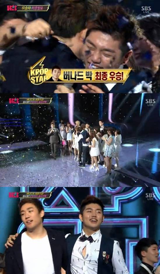 'K팝스타3' 샘김이 버나드박의 우승을 진심으로 축하해줬다.지난 13일 방송된 SBS '일요일이 좋다-K팝스타 시즌3'(이하 K팝스타3)에서는 역대 시즌 사상 최초로 남남(男男) 구도를 이끌어낸 버나드박과 샘김의 숨 막히는 경연이 펼쳐졌다.마지막 순간까지 엎치락뒤치락하는 초박빙 대결 끝에 버나드박이 'K팝스타3' 우승자가 됐다. 샘김은 버나드박의 최종우승이 확정되자 그를 끌어안고 자신의 일인듯 기뻐하는 모습을 보여 훈훈함을 자아냈다.앞서 MC 전현무는 "기분이 어떠냐"는 질문에 샘김은 "여기까지 오고 너무 감사하다. 이거 하면서 힘든 시간도 있었지만 같이 형이랑 있어 너무 좋고 형한테 져도 영광이고 사랑한다"고 애정을 드러냈다.이후 샘김은 "당연히 형이 받을 자격이 있다. 나는 이 무대까지 온 것도 영광이다"라며 "첫 무대에서 더 잘했더라면 하는 아쉬움은 있지만 형이 이겨서 나도 흐뭇하다"고 전했다.[K팝스타3 샘김, 사진=SBS 'K팝스타3' 방송 캡처]