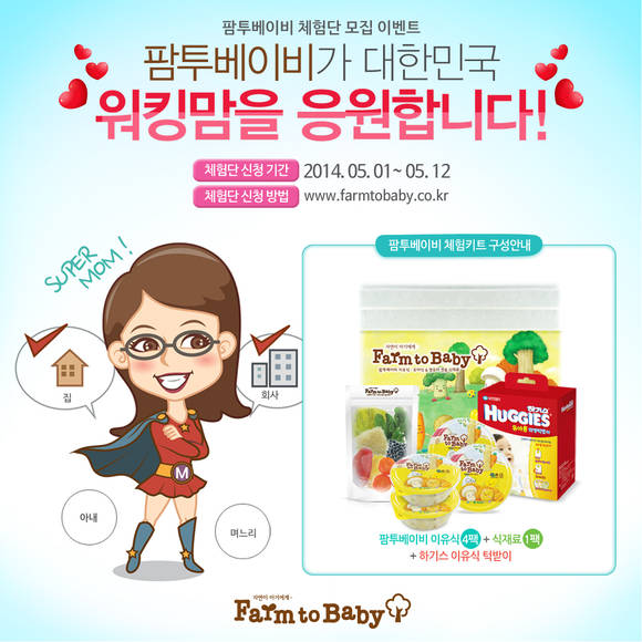 친환경농산물 최대산지 전남 나주의 식재료로 이유식을 제조하는 영유아식 전문 브랜드 팜투베이비(표 김영식)가 5월 가정의 달을 맞아 '워킹맘 체험단'을 모집한다고 30일 밝혔다.5개월~15개월의 아기를 둔 워킹맘이라면 누구나 지원 가능하며 선발된 100명의 체험단에게는 이유식 4팩과 식재료 1팩, 하기스 이유식 턱받이가 포함된 팜투베이비 체험키트가 제공된다.(준비기와 초기는 이유식 6팩, 유아식은 국·반찬 6팩과 하기스 이유식 턱받이가 제공된다.)1일부터 12일까지 진행되는 워킹맘 체험단 지원방법은 팜투베이비 공식홈페이지 내 해당 이벤트 페이지를 본인의 카페나 블로그에 스크랩하여 스크랩한 URL을 팜투베이비 '체험단 신청하기' 게시판에 등록하면 된다. 최종합격자는 14일 공식홈페이지와 유선을 통해 개별로 발표된다. 체험단 중 베스트 후기를 올린 엄마들에게는 백화점 상품권, 하기스 물티슈 등 다양한 경품이 증정된다.팜투베이비 관계자는 "대한민국 워킹맘들은 직장에서는 좋은 직원, 집에서는 아내와 엄마의 역할을 모두 수행해야 하는 슈퍼우먼이라고 생각된다. 육아와 일 두 마리 토끼를 모두 잡아야 하는 워킹맘들을 응원하기 위해 이번 체험단 모집 이벤트를 기획한 만큼 많은 관심을 부탁 드린다"고 전했다.한편 팜투베이비 워킹맘 체험단 모집에 대한 자세한 정보는 공식 홈페이지에서 확인할 수 있으며, 홈페이지에서 첫 구매고객 사은 이벤트 등 다양한 이벤트가 진행 중이다.