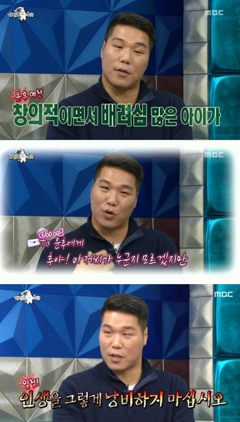 서장훈이 가수 윤민수의 아들 윤후의 열혈팬임을 밝하며 악플러들에게 일침을 가했다.지난 4월 30일 방송된 MBC '황금어장-라디오스타'에는 배우 김민종, 전 농구선수 서장훈, 방송인 전현무, 걸그룹 씨스타 소유가 출연해 재치있는 입담을 뽐냈다.이날 서장훈은 "세상에서 가장 좋아하는 연예인이 윤후"라며 "윤후처럼 창의적이면서 배려심 많은 아이가 쉽게 나오지 않는다. 특별하고 정말 좋다. 뭐든지 해줄 수 있다"고 말했다.또한, 서장훈은 윤후에게 "후는 아저씨가 누군지 모르겠지만 정말 팬이고, 꼭 한 번 만날 수 있었으면 좋겠다. 화이팅"이라는 영상편지를 남겼다.이어 "윤후한테 악플 다는 일부 몰지각한 사람들, 인생을 그렇게 낭비하지 마라. 애한테 뭐하는 짓거리냐"고 경고했다.[서장훈 윤후 악플러 일침, 사진=MBC '라디오스타' 방송 캡처]