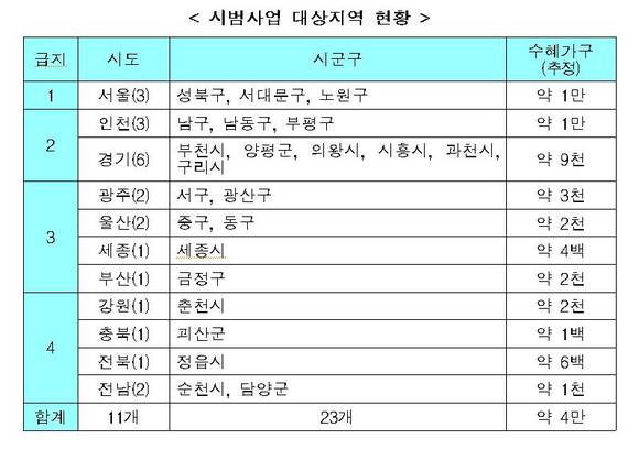 국토교통부는 서울 성북구, 전남 순천시 등 주거급여 개편에 따른 시범사업지역 23곳을 선정했다고 1일 밝혔다.선정된 지역은 임차료가 높은 1급지(서울)가 3곳, 2급지(인천·경기) 9곳, 3급지(광역시) 6곳, 4급지(지방) 5곳 등이다. <표 참조>주거급여는 정부가 전·월세 거주 저소득층에 임차료나 수선유지비 등 주거비용을 지원하는 사업이다.새 주거급여는 10월 본격 시행될 예정으로 정부는 총 57억여원을 투입해 7~9월 석 달간 시범지역 내 기존 지급 대상자에게 평균 5만원을 추가 지급한다.추가 지급액은 1급지 7만원쯤, 4급지 3만원쯤으로 차등 지급된다.국토부 관계자는 "주거급여 개편으로 지급대상이 73만 가구에서 97만 가구로 늘게 된다"며 "한국토지주택공사에서 5, 6월 대상가구에 대한 조사를 벌일 계획"이라고 말했다.