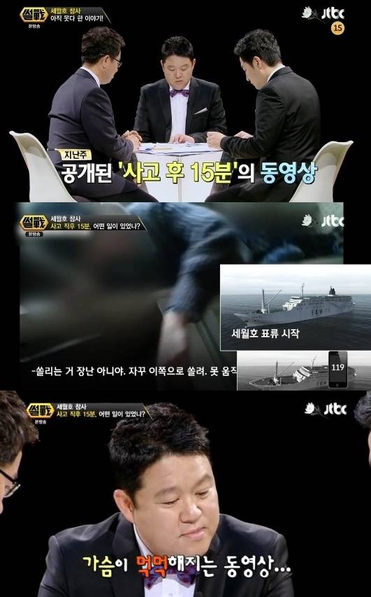 '썰전' 김구라가 세월호 동영상을 보고는 한동안 침묵했다.지난 1일 방송된 JTBC '썰전'에서는 '세월호 참사, 못 다한 이야기'라는 주제로 세월호 침몰 참사와 관련해 이야기를 나누는 시간을 가졌다.이날 방송에는 단원고 학생인 박모 군이 찍은 세월호 침몰 당시의 상황이 담긴 15분 영상이 공개됐다.공개된 영상에는 학생들이 '자리를 지켜라'는 안내방송을 듣고 구명 조끼를 입고 자리에서 대기하고 있거나, 혼란 속에서 서로를 걱정하며 구명조끼를 챙겨주는 장면이 담겨 있었다.동영상을 본 김구라는 "이 영상을 처음 봤다"라며 한동안 말을 잇지 못했고, 스튜디오에는 정적이 감돌았다. 강용석 역시 고개를 떨군 채 복잡한 감정을 드러냈다.'썰전' 김구라의 모습을 접한 네티즌들은 "썰전 김구라의 침묵 공감된다", "세월호 영상 보니 또 울컥한다", "썰전 김구라 침묵 무슨 말이 필요하랴", "세월호 영상 다시 봐도 먹먹하고 안타깝다", "썰전 김구라 침묵 나라도 그랬을 듯" 등의 반응을 보였다.[썰전 김구라, 사진=JTBC '썰전' 방송 캡처]