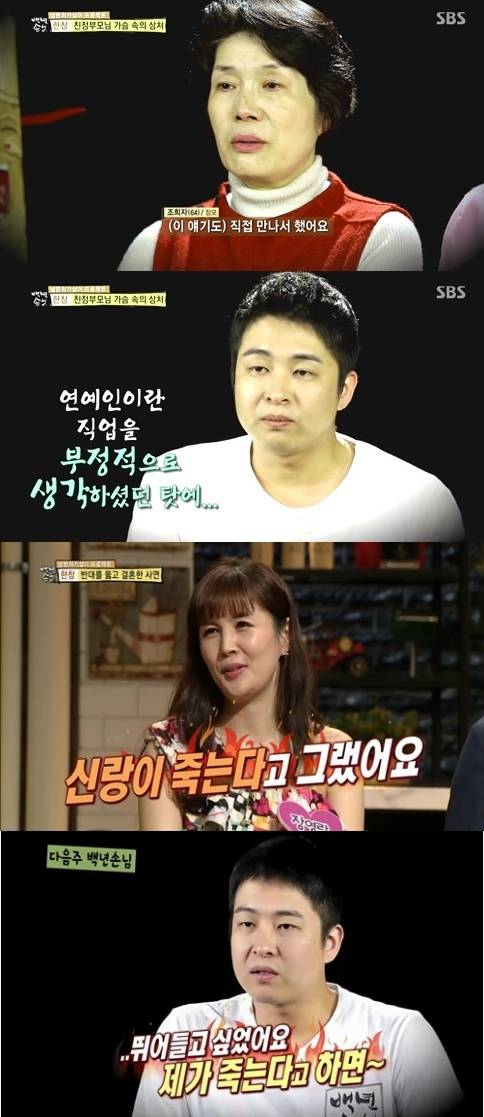'자기야' 장영란이 시댁의 결혼 반대가 심했다고 고백했다.지난 8일 방송된 SBS '자기야 백년손님'에서는 장영란의 한의사 남편 한창이 처가살이를 하는 모습이 그려졌다.이날 한창은 "저희 부모님께서 초반에 반대를 하셨다"며 "연예인이라는 직업을 부정적으로 생각하셨던 탓에 그런 부분에 대해서 짝이 아니라고 생각하셨던 것 같다"고 말했다.이에 장영란은 "방송에 나오는 이미지가 너무 비호감이고 내가 신랑보다 나이도 많아서 시부모님이 결혼 전에 반대를 좀 하셨다"고 털어놨다.이어 "지금은 '우리 아기'라 부르신다. 나는 자주 겪으니까 응어리가 풀렸는데 친정 부모님은 아직 응어리가 남아있는 것 같다"며 "사실 신랑이 언론에 결혼 사실을 먼저 공개했다. 시부모님은 허락도 안 하신 상태에서 어쩔 수 없이 결혼식에 참석하셨다"고 전했다.'자기야' 장영란의 이야기에 MC들은 결혼 허락을 받게 된 계기에 대해 물었고, 장영란은 "신랑이 죽는다고 했었다"고 밝혀 주위의 놀라움을 자아냈다.[자기야 장영란, 사진=SBS '자기야' 방송 캡처]