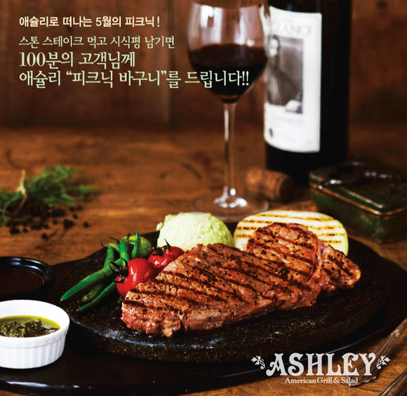 아메리칸 그릴 & 샐러드 애슐리에서 가정의달 5월을 맞아 스톤 스테이크를 먹은 고객들을 대상으로 피크닉 바구니를 증정하는 이벤트를 진행한다.애슐리의 스톤 스테이크는 뜨거운 스톤 위에서 직접 스테이크를 구워먹는 방식으로 좀더 특별한 식사를 완성시켜줄 메뉴로 꾸준히 사랑 받아왔다. 2인이 함께 즐길 수 있는 빅사이즈의 '스톤 빅 등심 스테이', 부드러운 살치살이 일품인 '롱아일랜드 스톤 스테이크', 채끝살의 부드러움과 쫄깃함을 느낄 수 있는 '뉴욕 스톤 스테이크'등 세 종류가 준비되어 있다.이번 이벤트는 이달 말까지 애슐리의 스톤 스테이크를 즐기고, 시식평을 본인의 블로그에 올린 후 게시물 URL을 애슐리 공식 블로그 이벤트 페이지에 댓글로 올리는 방식으로 진행된다.우수작 작성자 총 100명에게 그릇과 컵, 수저 등이 패밀리 세트로 준비된 9만원 상당의 애슐리 피크닉 바구니를 증정한다. 발표는 내달 10일 애슐리 공식 블로그에서 확인 가능하다.또한 더블애슐리 한정메뉴 시식평 이벤트도 함께 진행된다. 현재 더블애슐리 한정메뉴 프로모션을 진행하고 있는 10개의 매장(가산점, 구리점, 인천논현뉴코아아울렛점, 여의도점, 오리역점, 부산덕천뉴코아아울렛점, 광주유스퀘어점, 안양평촌NC백화점, 판교월드마크점, 홍대점)에서 한정메뉴를 먹고 본인의 블로그에 시식평을 올리는 방식이다.더블애슐리 한정메뉴는 피자와 그릴메뉴 등 기존 메뉴들을 업그레이드 하고, 새롭게 연어존을 선보이며 두 배의 가치, 두 배의 혜택으로 준비된 프로모션이다.시식평 게시물 URL을 애슐리 공식블로그 이벤트 페이지에 댓글로 남기면 참가 신청이 되며, 우수 작성자 10명을 선정하여 김건모, DJ DOC, 조성모, 룰라 등이 출연하는 청춘나이트 콘서트 2014 티켓(R석, 1인 2매)을 증정한다. 본 이벤트는 5월 25일 까지 진행되며 발표는 5월 30일 애슐리 블로그를 통해 확인할 수 있다.