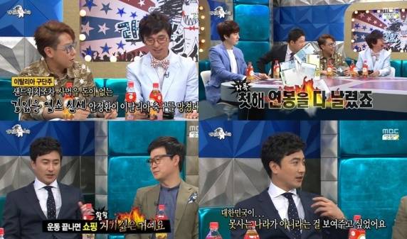 MBC 축구 해설위원으로 변신한 전 축구선수 안정환이 이탈리아 구단에 몸 담고 있던 시절 일부러 명품 치장을 했다고 털어놨다.지난 14일 방송된 MBC '황금어장-라디오스타'에는 '아빠! 브라질 가?' 특집으로 캐스터 안정환 송종국, 김성주, 해설가 서형욱이 출연해 솔직한 입담을 뽐냈다.이날 윤종신은 "안정환이 2002 한일 월드컵 이탈리아전 골 때문에 당시 뛰고 있던 이탈리아 구단주가 '샌드위치조차 사먹을 돈이 없는 길 잃은 염소 신세 안정환이 이탈리아 축구를 망쳤다'는 표현을 했다"고 밝혔다.이에 안정환은 "이탈리아는 대한민국을 북한같이 가난한 나라인 줄 안다. 일부러 돈 많이 썼다. 축구 훈련 끝난 후 쇼핑 많이 했다. 이미지를 바꿔보려고 명품도 사고 하느라 첫해 연봉을 다 날렸다"고 말했다.이어 안정환은 "한국 사람인데 자존심이 상해서 운동 끝나면 쇼핑하러 갔다. 걔네들한테 지기 싫었고, 한국이 가난하고 못하는 나라가 아니라는 걸 보여주고 싶었다"고 덧붙였다.[안정환, 사진=MBC '라디오스타' 방송 캡처]