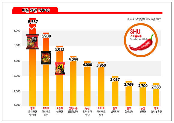 강렬한 매운맛을 즐기는 소비자가 점점 늘어나는 추세다. 이에 라면업체들은 더 매운 라면을 출시하거나, 기존제품을 더 맵게 리뉴얼하는 등 매운맛 경쟁이 치열하게 전개되고 있다.지난해 매운 라면의 점유율은 전체 라면시장 대비 59.3%포인트로 라면시장의 절대강자로 자리 잡았다. 팔도는 지난 3월 '비빔면'류 제품 중에 가장 매운 ‘팔도쫄비빔면’(2769SHU)을 출시했다. '팔도쫄비빔면'은 기존 '팔도비빔면'(357SHU)보다 8배 정도 더 매운 제품이다. 지난해는 농심 '진짜진짜'라면과 오뚜기 '열라면' 등이 더욱 맵게 리뉴얼되며, 매운 라면시장을 선점하려는 라면업체들의 노력도 계속되고 있다.국내에 출시된 라면 중 가장 매운 라면 1위부터 10위까지 순위를 매긴 결과, 스코빌지수(SHU, Scoville Heat Unit)에 따라 1위는 팔도에서 판매하고 있는 '틈새라면빨계떡'이 8557SHU로 가장 매운 라면으로 분석됐다. 2위는 이마트의 '도전하바네로라면'(5930SHU), 3위는 오뚜기 '열라면'(5013SHU)이었다.다음으로는 ‘불닭볶음면’(4404SHU), '진짜진짜'(4000SHU), '하바네로짬뽕'(3960SHU), '남자라면'(3037SHU), '팔도쫄비빔면'(2769SHU), '신라면'(2700SHU), '불낙볶음면'(2588SHU) 순이었다.스코빌지수는 1912년 미국의 화학자인 윌버 스코빌이 개발한 지수로 매운맛을 측정하는 기준으로 사용되는 국제규격이다. 일반적으로 청양고추는 4000~1만SHU, 한국의 보통 고추는 4000~7000SHU로 알려져 있다.특히 국물 없는 라면시장의 성장도 매운맛을 강조한 제품들이 이끌고 있다. 삼양식품 '불닭볶음면'과 팔도의 '팔도쫄비빔면', '불낙볶음면'이 매운 라면 순위 10위 안에 위치하고 있다.이무상 팔도 면연구팀장은 "최근 매운맛을 강조한 라면 제품들이 출시되거나 리뉴얼되면서 매운 라면 순위도 요동치고 있다"며 "매운맛을 찾는 소비자들이 점점 늘어나면서 업계의 매운맛 경쟁도 더욱 치열해질 것으로 예상된다"고 말했다.