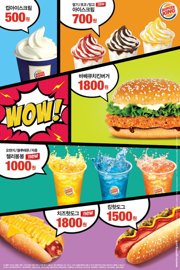 버거킹(대표 문영주)이 다가오는 여름을 맞이하여 23일 디저트 메뉴와 스낵 메뉴를 대폭 강화한 'WOW 시리즈'를 새롭게 출시한다.'WOW 시리즈'는 하루종일 합리적인 가격으로 간편하게 즐길 수 있도록 구성된 버거킹의 대표 디저트/스낵 메뉴군으로, 기존 인기 스낵 메뉴인 킹핫도그(단품 1500원/콤보 2500원)와 치즈핫도그(단품 1800원/콤보 2800원), 바베큐치킨버거(단품 1800원/콤보 2800원), 딸기/초코와 함께 망고 맛이 추가된 아이스크림 메뉴(정가 700원) 등으로 이루어져 있다.특히 이번 'WOW 시리즈'를 통해 새롭게 출시된 '젤리봉봉(정가 1000원)'은 오렌지, 블루레몬, 자몽맛 3가지로 이루어진 젤리 음료이다. 말랑말랑한 젤리가 들어있어 씹는 맛과 상큼한 과일맛을 동시에 즐길 수 있는 여름판 한정 메뉴로 소비자들에게 큰 인기를 끌 것으로 기대된다.한편 버거킹은 새로운 'WOW 시리즈' 출시를 맞아 23일부터 'WOW 스낵' TV CF를 방영할 예정이다. 본 TV CF에서는 경쾌한 음악과 제품의 특성을 재미있게 묘사해 누구나 쉽게 따라할 수 있는 흥겨운 'WOW춤'을 선보이며 소비자들에게 즐거운 웃음을 선사한다.'WOW 시리즈' 프로모션은 23일부터 7월 24일까지 버거킹 전국 매장에서 진행된다.(단 일부 매장 제외)