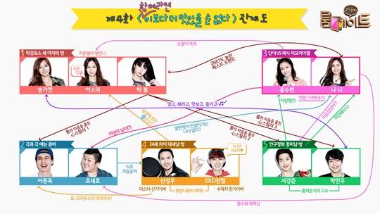 '룸메이트' 인물 관계도가 공개됐다.SBS '일요일은 좋다-룸메이트' 제작진은 공식 홈페이지를 통해 25일 방송될 4회의 인물 관계도를 게재했다.인물관계도는 각 방 룸메이트 외에 다른 출연자들과의 이색 라인을 선보였다. 특히, 2NE1 멤버들도 놀랄 정도로 베스트 프렌드가 된 박봄과 나나, 그리고 봄의 마음을 훔친 心스틸러로 세 명의 남성 출연자들이 지목돼 눈길을 끈다.비주얼방 홍수현과 나나는 '역전 자매요리'로 또 어떤 활약을 보여줄지 보는 이들의 기대감이 높아지고 있다.한편, '룸메이트'는 톱스타 11인의 홈 쉐어를 콘셉트로 삼은 프로그램으로, 매 회 리얼한 일상을 선보여 네티즌들과 시청자들의 인기를 끌고 있다. 25일 오후 4시 5분 4회가 방송된다.[룸메이트 인물 관계도, 사진=SBS]