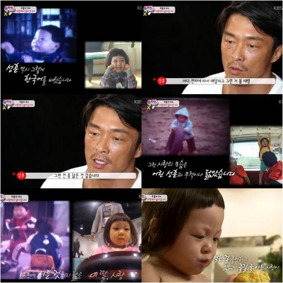 '슈퍼맨이 돌아왔다' 추성훈이 딸 추사랑이 자신의 어렸을 때 모습과 많이 닮았다고 털어놨다.25일 오후 방송된 KBS 2TV '해피선데이-슈퍼맨이 돌아왔다'(이하 '슈퍼맨이 돌아왔다')에서 추성훈 추사랑 부녀는 알콩달콩 하루를 보냈다.이날 추사랑은 한국어 선생님의 '그대로 멈춰라' 노래에 맞춰 춤을 추는 등 일취월장한 한국어 실력을 자랑했다.이러한 모습을 흐뭇하게 바라보던 추성훈은 자신의 어릴적 모습을 떠올리며 "나도 어머니한테 한글을 배울 때 춤추면서 배웠다고 하더라. 사랑이도 한국어를 배울 때 춤추면서 배우는 거 보니까 깜짝 놀랐다"고 말했다.이어 "사랑이가 전차에 타서 매달리는 걸 보니 힘은 나를 좀 닮은 것 같다. 나도 특별히 차를 좋아하는데, 자동차를 좋아하는 사랑이의 모습을 보면 예전의 내가 떠오른다"고 회상했다. 이때 추성훈의 어릴적 영상과 추사랑의 영상이 교차 편집되며 닮은꼴 부녀를 인증했다.또한, 추성훈은 추사랑의 식탐에 대해 "솔직히 내가 어릴 때는 집이 잘사는 편이 아니었다"라며 "먹는 거는 사랑이가 나보다 2~3배 많이 먹는 것 같다. 그건 좀 나와 다른 것 같다"고 밝혀 웃음을 자아냈다.['슈퍼맨이 돌아왔다' 추성훈 추사랑, 사진=KBS2 '슈퍼맨이 돌아왔다' 방송 캡처]