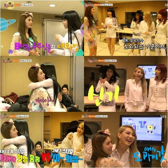 '룸메이트' 나나와 박봄의 다정한 스킨십에 씨엘이 경악했다.나나는 25일 방송된 SBS '일요일이 좋다-룸메이트'에서 '인기가요'에 함께 출연하게 된 박봄을 보기 위해 2NE1의 대기실을 깜짝 방문했다.대기실을 찾은 나나는 2NE1 멤버들을 향해 "안녕하세요 오렌지캬라멜 나나입니다. 오늘은 컵케이크를 달고 왔습니다"고 자신을 소개했다.이어 '룸메이트' 나나와 박봄은 8차원 대화를 이어갔고, 두 사람은 서로를 포옹하며 애정 가득한 스킨십을 선보였다.이를 지켜보던 2NE1의 씨엘, 산다라박, 공민지는 "박봄이 우리 멤버에게 하는 것과 전혀 다르다"며 서운함을 드러냈다.특히, 2NE1의 리더 씨엘은 "저희는 막 손잡고 그런 거 별로 안 좋아한다"라며 "나와 에너지가 잘 안 맞는 것 같다"고 고개를 절레절레 흔들었다. 그럼에도 '룸메이트' 나나는 "난 채린이 좋아"라고 스킨십을 시도했고, 씨엘은 억지 웃음을 지었다.[룸메이트 나나 씨엘, 사진=SBS '룸메이트' 방송 캡처]