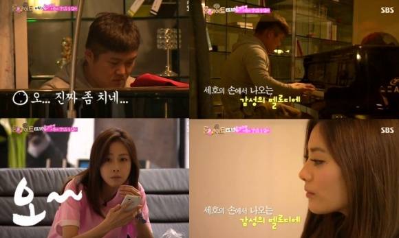 조세호의 피아노 실력에 나나 홍수현이 깜짝 놀랐다.조세호는 지난 25일 방송된 SBS '일요일이 좋다-룸메이트'에서 나나, 홍수현, 박민우 앞에서 숨겨둔 피아노 실력을 공개하며 반전 매력을 드러냈다.이날 조세호는 패닉의 '달팽이'를 연주하기 시작했고, 조세호의 피아노 실력에 나나 홍수현은 "오빠 피아노 치는 거 진짜 의외다"며 놀라움을 감추지 못했다.홍수현은 조세호의 피아노 연주에 푹 빠졌고, 나나도 진지하게 피아노를 연주하는 조세호의 모습에 색다른 매력을 느꼈다.조세호의 연주가 끝나자 나나 홍수현은 "정말 잘 친다"며 칭찬을 아끼지 않았다. 박민우 역시 "멋있는 남자"라고 감탄했다.조세호는 제작진과의 인터뷰에서 "그날 나나의 눈빛이 다른 때와는 달랐다"면서 "이동욱과 서강준이 없으니 나한테도 기회가 오나 보다"라고 밝혀 웃음을 자아냈다.[나나 홍수현 조세호 피아노 감탄, 사진=SBS '룸메이트' 방송 캡처]