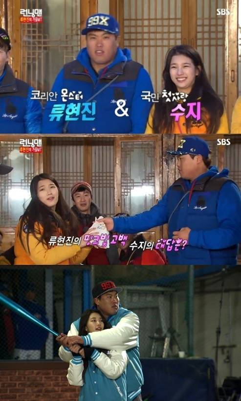 류현진과 수지의 과거 달달한 모습이 다시 눈길을 사로잡고 있다.수지는 LA다저스와 신시네티레즈의 경기가 열리는 29일 오전 9시(이하 한국시간) 류현진의 등판일에 맞춰 시구자로 나설 예정이었다.하지만 류현진의 부상 등 여러 이유로 그의 등판 일정이 27일로 앞당겨지면서 수지는 이날 경기장을 찾아 류현진이 선발 등판한 경기를 관전했다. 수지 시구는 예정대로 29일에 진행한다.앞서 류현진과 수지는 지난해 11월 방송된 SBS '일요일이 좋다-런닝맨'에 출연해 핑크빛 러브라인을 형성하며 깨알 재미를 선사했다.수지는 류현진이 건넨 붕어빵에 크게 감동받는가 하면, 여왕피구에서는 파트너로 호흡을 맞추며 다정한 모습을 연출했다.특히, 초능력 야구에서 류현진은 야구가 서툰 수지를 위해 이해하기 쉽게 설명을 해주면서 의도치 않게 백허그를 시도해 화제를 모으기도 했다.[류현진 수지, 사진=SBS '런닝맨' 방송 캡처]