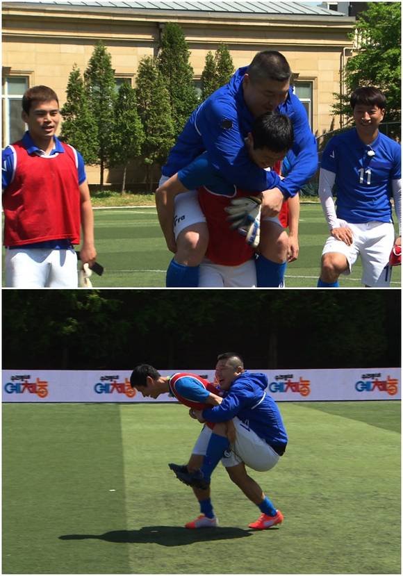 '우리동네 예체능' 이영표가 본인 몸무게에 두 배에 달하는 강호동을 업고 전력 질주했다.27일 방송될 KBS 2TV '우리동네 예체능'에서는 '예체능' 축구부와 '일원 FC'의 첫 경기가 열리는 가운데, 이영표가 강호동을 등에 업고 전력 질주하는 모습이 포착됐다.공개된 사진 속 이영표는 강렬히 내리쬐는 햇빛 아래 파래진 입술과 창백한 낯빛을 드러내고 있다. 이와 달리 땅바닥에 닿을 듯 말듯한 코끼리 엉덩이를 자랑하며 이영표 등에 대롱대롱 매달려 있는 강호동의 해맑은 모습이 웃음을 터트리게 한다. 이 같이 상상초월의 광경은 '일원 FC'와의 경기에 앞서 이뤄진 '예체능' 축구부 훈련 중 포착된 것.훈련 중 강호동은 자신의 어부바 상대로 일말의 고민도 없이 이영표를 지목하며 "영웅 등에 언제 업혀보겠니?"라고 말해 이영표를 당황하게 했다. 이에 강호동의 스페셜한 간택을 받은 이영표는 낯빛이 1초가 다르게 어두워졌다고.동료 선수들 역시 강호동을 업은 채, 전력질주를 마다 않으며 '괴력의 사나이'로 변신한 이영표에게 "국가대표 훈련보다 더 힘든 것 같다"면서 응원 폭격을 가했다는 후문이다.KBS2 화요일 예능 '우리동네 예체능'은 27일 밤 11시 20분 방송된다.['우리동네 예체능' 이영표 강호동 어부바, 사진=KBS 2TV '우리동네 예체능']