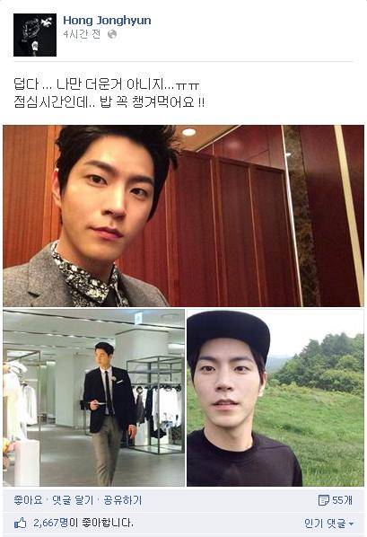 걸스데이 유라와 함께 '우결'에 합류하는 모델 겸 배우 홍종현의 근황이 포착됐다.홍종현은 28일 자신의 페이스북에 "덥다. 나만 더운거 아니지? 점심시간인데 밥 꼭 챙겨먹어요"라는 글과 함께 세 장의 사진을 올렸다.공개된 사진 속 홍종현은 멋진 수트를 차려입고 남성미를 발산하는가 하면, 모자를 쓴 채 카메라를 향해 살짝 미소 짓고 있다.홍종현 '우결' 합류 소식을 접한 네티즌들은 "홍종현 유라 우결 기대된다", "홍종현 유라 잘 어울리는 듯", "홍종현 우결 유라와 어떤 케미를 보여줄까?", "벌써부터 설레어", "홍종현 우결 출연 철벽남 무너지나" 등의 반응을 보였다.한편, 28일 MBC에 따르면 홍종현과 유라는 '우리 결혼했어요 시즌4'(이하 우결) 새 커플로 합류해 이날 오후 첫 만남을 가진 것으로 알려졌다. 홍종현 유라의 가상결혼을 볼 수 있는 MBC '우리 결혼했어요'는 6월 7일 방송된다.[홍종현, 사진=홍종현 페이스북]