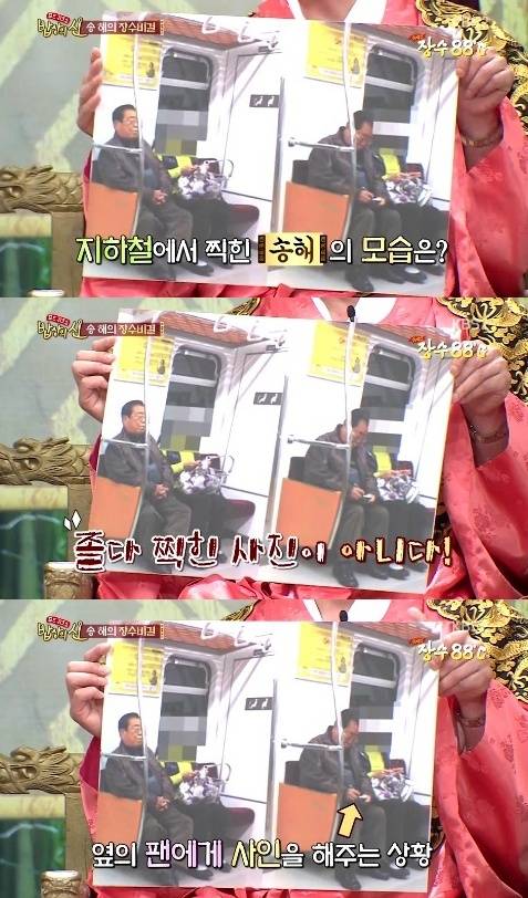 방송인 송해가 지하철에서 찍힌 사진에 대해 해명했다.송해는 지난 29일 방송된 KBS 2TV '밥상의 신'에서 장수비결 중 하나로 대중교통 이용을 꼽아 이목을 끌었다.그는 "여기에 올 때도 지하철을 탔는데 건강에 큰 도움을 줬다고 본다"며 "나에게는 BMW다. 'B는 버스를 탄다. M은 메트로 지하철이다. W는 워킹을 한다'는 뜻이다"고 설명했다.이에 제작진은 지하철을 이용한 송해의 모습이 담긴 사진을 공개했다. 이는 네티즌들이 SNS에 올린 것으로 사진 속 송해는 노약자석에 앉아 고개를 살짝 숙이고 있다. 당시 일부 네티즌들은 이를 두고 "졸고 있는 것 아니냐"는 오해를 불러일으켰다.송해는 "졸고 있었다는 것은 오해다. 옆에 있는 사람에게 사인을 해주고 있었던 것"이라고 밝혔다.송해 해명을 접한 네티즌들은 "송해 해명 아니었으면 진짜 조는 줄 알았겠다", "나도 지하철에서 만나고 싶어", "송해 해명 이제 오해하지 맙시다", "소탈한 모습 보기 좋아요", "송해 해명 귀엽다" 등의 반응을 보였다.[송해 해명, 사진=KBS2 '밥상의 신' 방송 캡처]