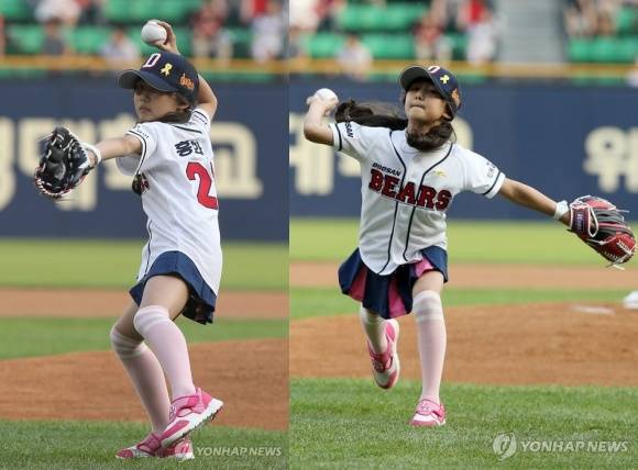 두산베어스 홍성흔의 딸 홍화리가 시구에 나섰다.30일 오후 서울 잠실야구장 '2014 한국야쿠르트 세븐 프로야구' 두산베어스와 롯데자이언츠 주말 3연전 첫 번째 경기가 열렸다.이날 두산의 상징인 남색과 핑크색을 조화시킨 의상을 입고 마운드에 오른 홍화리는 완벽한 동작을 선보이며 야무진 시구를 선보였다.홍화리는 현재 KBS 2TV 주말드라마 '참 좋은 시절'에서 옥택연의 딸 '동주' 역으로 출연해 맛깔나는 경상도 사투리 연기로 시청들의 많은 사랑을 받고 있다.홍화리 시구를 접한 네티즌들은 "홍화리 시구 귀여워", "홍화리 시구 아빠미소 절로", "홍화리 시구 힘차네", "홍성흔 흐뭇하겠다", "홍화리 시구 아빠 닮아 폼이 예사롭지 않아" 등의 반응을 보였다.[홍화리 시구, 사진=연합뉴스]
