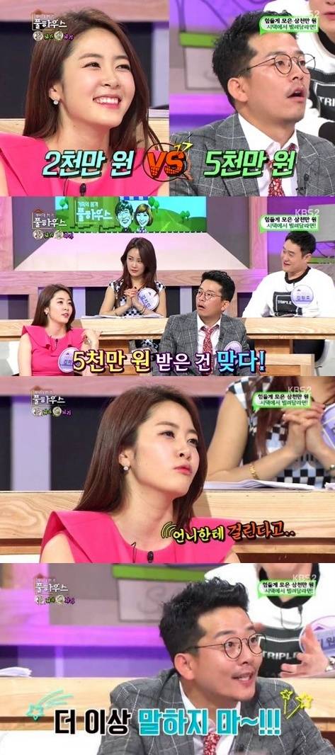 개그맨 김준호의 여동생 김미진이 오빠가 자신에게 5천만원을 빌려준 사연을 털어놨다.지난 30일 방송된 KBS 2TV '가족의 품격 풀하우스'에는 김준호 김미진 남매가 출연해 솔직한 입담을 뽐냈다.이날 김미진 오빠 김준호는 "동생과 같이 살다가 분가시키면서 5천만원을 빌려줬는데 그 돈이 행방불명됐다. 동생이 시집을 안 가면 언제 받을 수 있을지 모른다. 그런데 얘는 2000만원이라고 한다"고 말했다.이에 김미진은 "오빠가 기억을 못하는 것 같다. 당시에 오빠가 언니한테 걸린다고 5천만원이 아닌 2천만원을 빌렸다 하더라"고 주장했다.이어 "언니와 무슨 얘기를 하다가 자기가 말이 안 맞아서 걸린 거다. 나중에 2000만원으로 하자고 본인이 전화했다"고 밝혔다.[김미진 오빠 김준호, 사진=KBS2 '풀하우스' 방송 캡처]