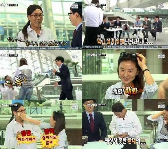 '밀회' 김희애와 '물회' 김영철이 만났다.지난 31일 방송된 MBC '무한도전'에서는 멤버들이 인천국제공항에서 김희애를 만나는 내용이 전파를 탔다.이날 김희애는 드라마 '밀회' 속 자신을 패러디한 '물회' 김영철에 대해 "내가 정말 그러나 싶었다. '날 싫어했었나'란 생각도 들었는데 자꾸 하니까 또 귀여웠다"고 전했다.이어 "우리 애가 이걸 보고 너무 징그러워 하더라. 그 얘기를 듣더니 어머님이 '그러지마라. 그 사람들도 먹고 살아야 하는데.."라고 밝혀 폭소를 자아냈다.이때 김영철이 드라마 속 김희애를 그대로 재연한 모습으로 깜짝 등장했고, 김희애는 김영철에게 "너 잘 만났다"며 장난스럽게 말을 건넸다. 이에 김영철은 김희애 앞에 바로 무릎을 꿇었다.김희애는 과한 물광화장을 하고 나온 김영철에게 다가가 "좀 닦아라. 닦아!"라며 직접 얼굴을 닦아줬다.예상치 못한 김희애의 환대에 김영철은 "어제 너무 떨려서 두 가지 예상 반응을 생각해봤다. 하나는 '왜 왔어?'라며 싸늘한 반응을 보이는 거였다"고 긴장감을 감추지 못했다.['무한도전' 김희애 김영철 만남, 사진=MBC '무한도전' 방송 캡처]