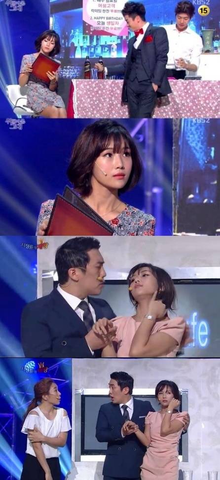 개그우먼 홍예슬의 뛰어난 미모가 화제를 모으고 있다.홍예슬은 지난 1일 방송된 KBS 2TV '개그콘서트'의 코너 취해서 온 그대'와 '시청률의 제왕'에 등장해 여배우급 미모로 시선을 사로잡았다.이날 '취해서 온 그대'에서 홍예슬은 짧은 원피스를 입고 각선미를 노출, 섹시한 매력을 뽐냈다. 이에 김대성은 홍예슬에게 "한눈에 호감을 느꼈다. 술을 한 잔 대접하고 싶다"고 추근댔다. 하지만 홍예슬은 김대성에게 퇴짜를 놔 웃음을 자아냈다.또한, '시청률의 제왕'에서는 리얼한 악역 연기로 눈길을 끌었다. 홍예슬은 이상훈의 내연녀로 등장해 "애도 못 낳는 주제에 어디서 본처 행세야?"라며 허안나의 뺨을 때리고 물세례까지 퍼부었다.특히, 홍예슬은 개그우먼이라고 믿기 힘들 정도로 상큼한 미모를 자랑했으며, 방송 직후 주요 포털사이트 실시간 검색어에 오르며 폭발적인 관심을 받았다.'개그콘서트' 홍예슬을 접한 네티즌들은 "김지민 긴장해야겠는걸", "개그콘서트 홍예슬 미모 대박!", "미녀 개그우먼 타이틀 홍예슬에게 내주나", "요즘 개콘은 얼굴 보고 뽑나?", "홍예슬 개그우먼 맞아?" 등의 반응을 보였다.['개그콘서트' 홍예슬 미모, 사진=KBS2 '개그콘서트' 방송 캡처]