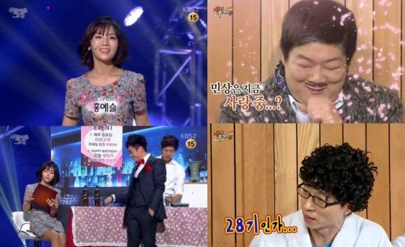 미녀 개그우먼의 계보를 잇는 홍예슬이 과거 개그맨 유민상의 짝사랑녀로 지목된 사실이 새삼 화제다.유민상은 지난 1월 2일 방송된 KBS 2TV '해피투게더3'에 출연해 KBS 28기 공채개그맨 중 짝사랑하는 상대가 있다고 깜짝 고백했다.이날 MC 유재석과 신봉선은 "유민상이 좋아하는 후배가 있다. KBS 28기 중 한명인 것으로 알고 있다"고 폭로해 유민상을 당황하게 만들었다.유민상은 "그걸 어떻게 알았냐. 과거 S양에게 장난감 총으로 장난을 치다가 '너 나랑 사귈래? 죽을래?' 이랬더니 후배가 나한테 '쏘십시오'라고 하더라"고 털어놔 웃음을 자아냈다.이에 네티즌들은 유민상의 짝사랑녀로 홍예슬을 지목했다. 홍예슬은 지난해 4월 합격한 KBS 공채 28기로 배우 뺨치는 미모와 늘씬한 몸매를 자랑한다.한편, 홍예슬은 지난 1일 방송된 KBS2 '개그콘서트'의 코너 '취해서 온 그대'에 등장해 짧은 원피스를 입고 늘씬한 각선미를 과시해 시청자들의 눈길을 끌었다.[개그콘서트 홍예슬, 사진=KBS2 '개그콘서트', '해피투게더' 방송 캡처]