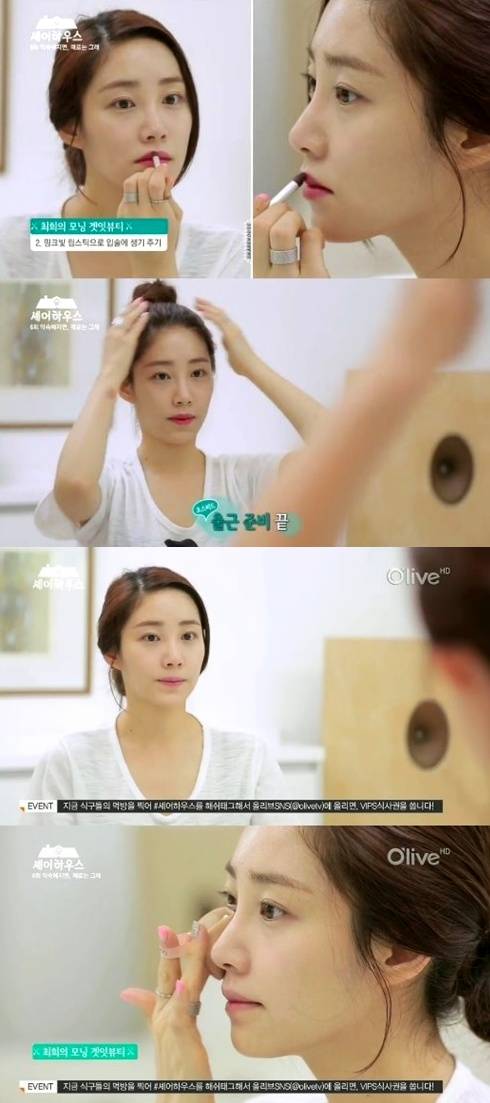 최희가 민낯을 공개했다.지난 4일 방송된 케이블채널 올리브TV '셰어하우스' 6회에서는 오전 7시에 일어나 홀로 출근 준비를 하는 최희의 모습이 그려졌다.이날 최희는 화장기 전혀 없는 민낯으로 화장대 앞에 앉아 출근 준비를 시작했다. 그녀는 BB크림을 바른 후 핑크빛 립스틱으로 포인트를 줬다. 이어 머리를 업스타일로 묶으며 모든 준비를 끝냈다.특히, 최희는 비비크림과 립스틱 등 초간단 화장만으로도 청순한 미모를 과시해 눈길을 사로잡았다.최희 민낯 공개를 접한 네티즌들은 "최희 민낯도 예쁘네", "최희 갈수록 미모 물 오르는 듯", "최희 민낯 공개 굴욕이 뭐예요?", "역시 야구여신의 위엄", "최희 민낯 완전 청순해", "화장 전과 후가 똑같아" 등의 반응을 보였다.[최희 민낯 공개, 사진=올리브TV '셰어하우스' 방송 캡처]