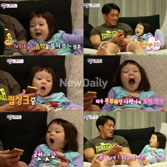 '슈퍼맨이 돌아왔다' 추사랑이 '렛잇고'를 열창했다.8일 방송된 KBS 2TV '해피선데이-슈퍼맨이 돌아왔다'(이하 '슈퍼맨이 돌아왔다')에서는 추성훈의 딸 추사랑이 애니메이션 '겨울왕국' OST '렛잇고'를 부르는 모습이 전파를 탔다.이날 아빠 추성훈이 "엄마가 내일 올까?"라고 묻자 추사랑은 "내일가?"하고 말했다. 급기야 두 사람의 이야기 주제는 '내일'이라는 단어에서 '렛잇고'로 이어졌다.이후 추성훈은 휴대전화로 'Let it go(렛잇고)'를 틀어줬고, 추사랑은 입을 벙긋대며 가사를 따라하다가 모르는 부분은 립싱크를 했다.특히, 추사랑은 노래가 절정에 이르자 한층 더 풍부한 표정으로 목청껏 부르며 깜찍한 매력을 발산했다. 열정적으로 부르는 사랑이의 모습에 추성훈은 흐뭇한 아빠미소를 지었다.[추사랑 '렛잇고' 립싱크, 사진=KBS2 '슈퍼맨이 돌아왔다' 방송 캡처]
