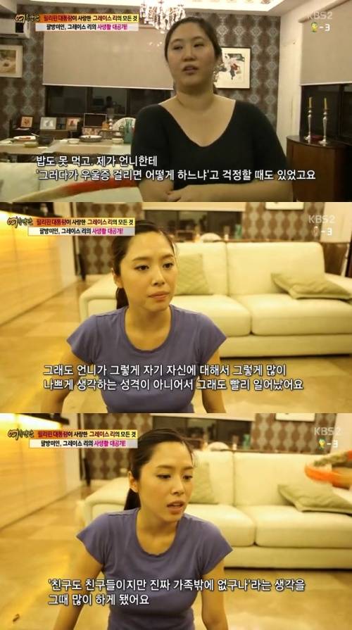 '필리핀 대통령 전 연인' 그레이스 리가 힘들었던 과거 열애 심경을 밝혔다.그레이스리는 10일 오전 방송된 KBS 2TV '여유만만'에 출연해 근황과 함께 리가 베니그노 아키노 필리핀 대통령과 풀 러브스토리를 공개했다.이날 그레이스 리 여동생은 "언니가 열애설 당시 밥도 못 먹고 많이 힘들어했다. 그때 언니가 살이 진짜 많이 빠졌다. 제가 언니한테 '그러다가 우울증 걸리면 어떻게 하느냐'고 걱정할 때도 있었다"고 말했다.이에 '필리핀 대통령 전 연인' 그레이스리는 "열애설 후 유명세를 탔지만 혹독한 악성 댓글 때문에 마음고생이 심했다"며 "비행기표를 끊어서 동생과 함께 2박3일 동안 싱가포르로 잠깐 도망갔다"고 털어놨다.또한, 그녀는 "그때는 친구도 친구지만 '진짜 가족 밖에 없구나'라는 생각을 많이 하게 됐다"고 전했다.한편, '필리핀 대통령 전 연인' 그레이스 리는 한국계 필리핀 방송인으로 필리핀 TV5 방송국의 메인 뉴스와 한류 소개 프로그램의 진행자로 활약하고 있다. 특히, 2012년 필리핀 아키노 대통령의 연인으로 밝혀지며 세간의 주목을 받았다.[필리핀 대통령 전 연인, 사진=KBS2 '여유만만' 방송 캡처]